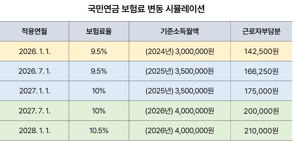 참고로 2024년, 2025년, 2026년의 기준소득월액(전년도 소득)이 각각 3,000,000원 / 3,500,000원 / 4,000,000원인 근로자의 국민연금 보험료 조정 · 적용일정은 다음과 같습니다.