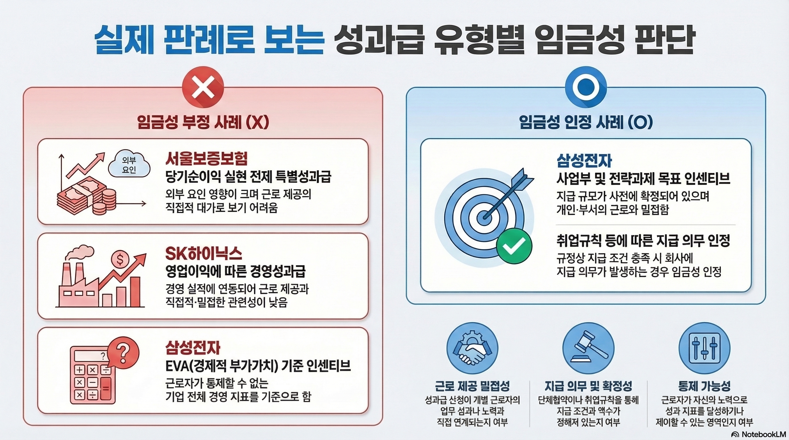 이번 판결은 같은 기업에서 지급한 성과급이라도 유형에 따라 임금성을 다르게 판단했습니다. 특히 삼성전자 사례는 성과급의 임금성 판단 기준을 명확히 제시했습니다.