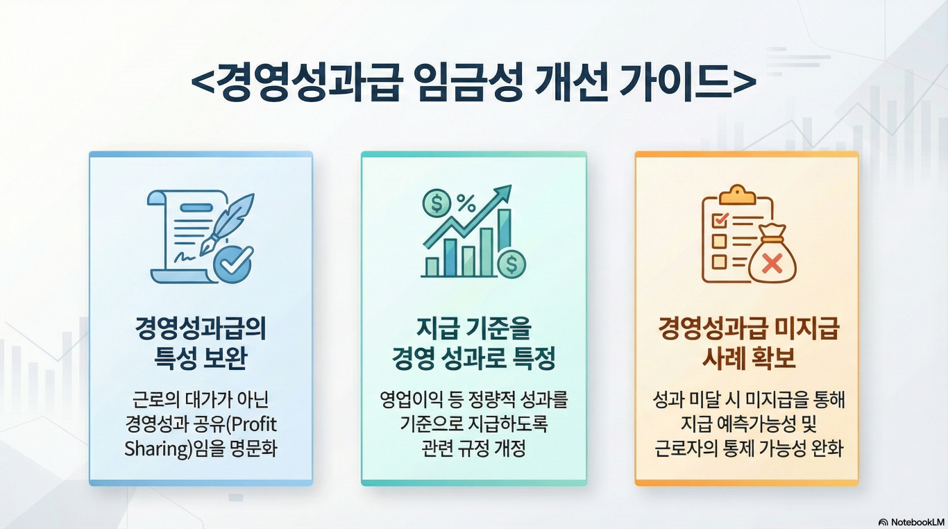 경영성과급 지급 기준을 '경영 성과'로 특정 경영성과급은 영업이익 등 기업의 정량적 성과를 기준으로 지급하도록 취업규칙, 보상규정 등을 개정하여 경영성과의 공유성을 강조 예) 경영성과급은 전년도 영업이익이 0,000원 이상인 경우에 지급한다.